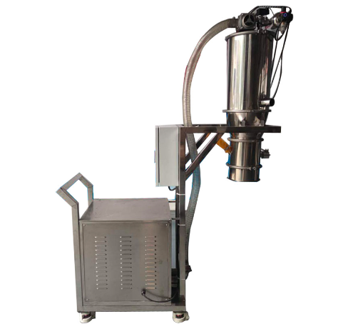 真空上料機(jī)是用真空泵抽氣,使吸料嘴進(jìn)口處及整個(gè)系統(tǒng)處于一定的真空狀態(tài),粉粒料隨同外界空氣被吸入料嘴,形成料氣流,經(jīng)過吸料管到達(dá)料斗,在料斗中進(jìn)行氣、料分離。分離后的物料進(jìn)入受料設(shè)備。輸送、放料是通過氣動(dòng)三通閥不斷地開、閉來完成的,而氣動(dòng)三通閥的開閉是由控制中心來控制的。 ZKS 真空上料機(jī)中裝有壓縮空氣反吹裝置,每次放料時(shí),壓縮空氣脈沖反吹過濾器,把吸附于過濾器表面的粉末打落下來,使吸料能正常運(yùn)行。